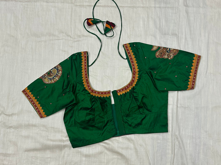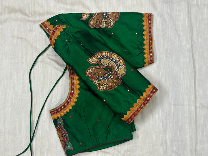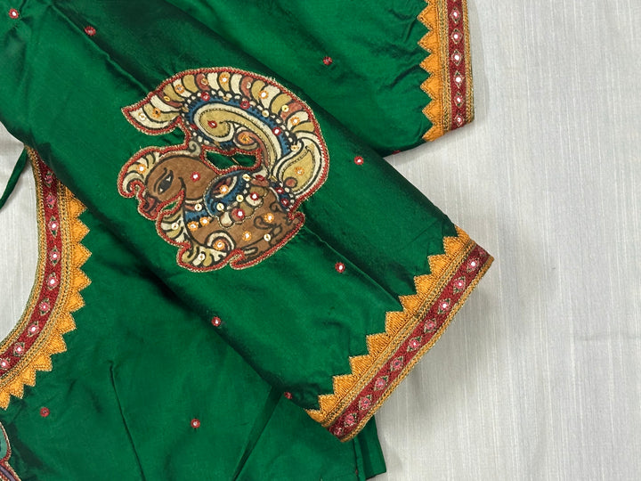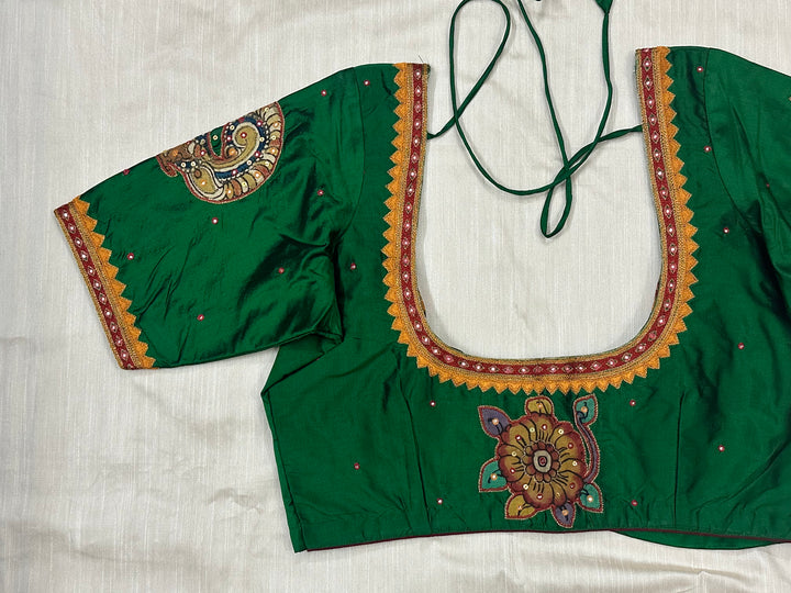Bottle green Kanjeevaram silk blouse, Pen Kalamkari flower neckline, embroidered sleeves, Annam birds - Size 40