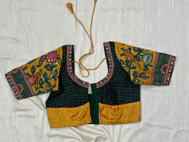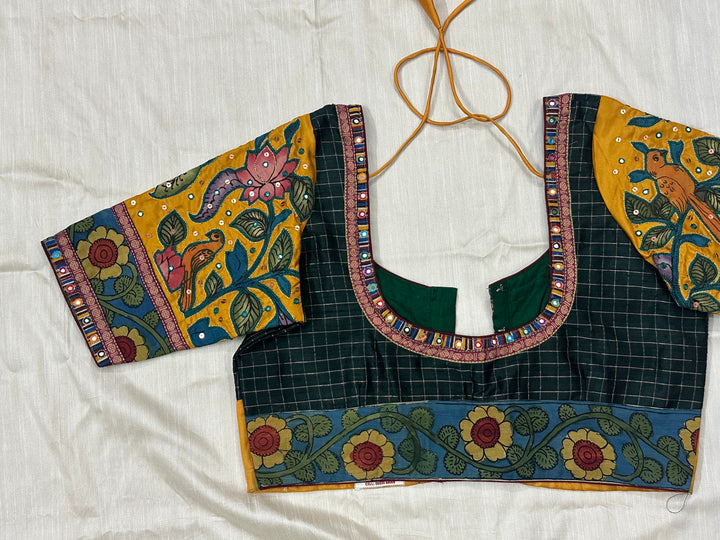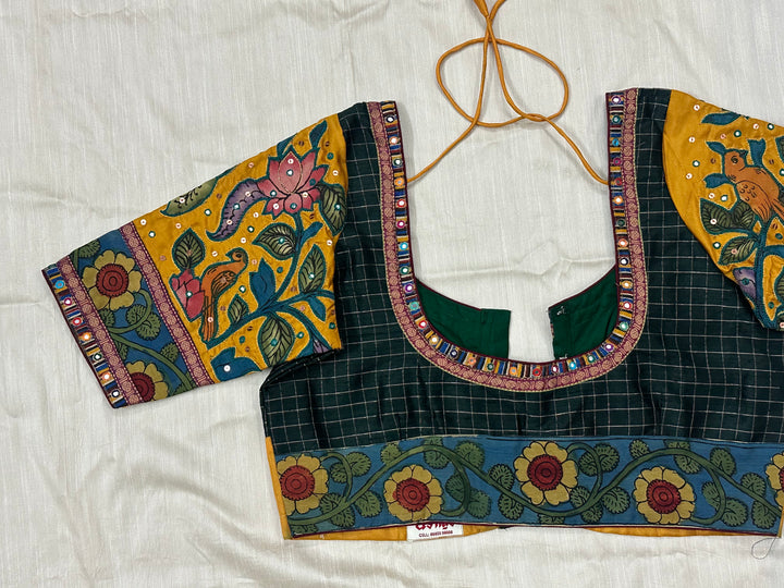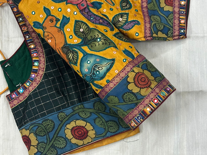 Bottle green raw silk blouse, yellow Kanjeevaram sleeves, sequins, mirrors, Kalamkari Annam border - Size 40