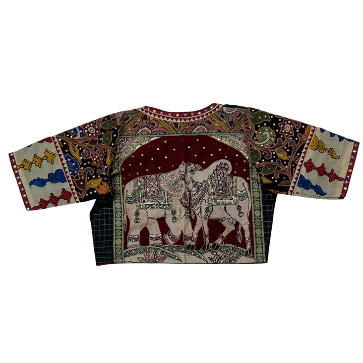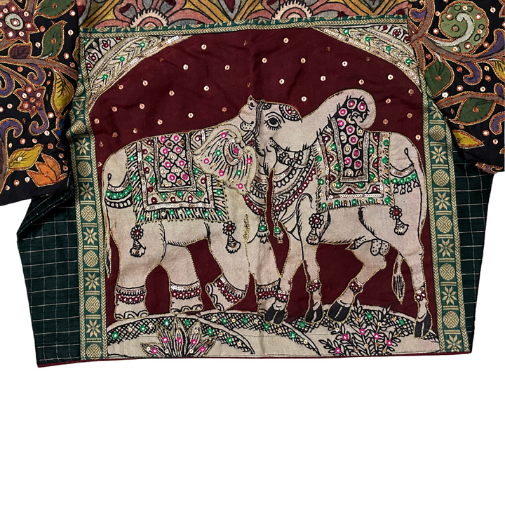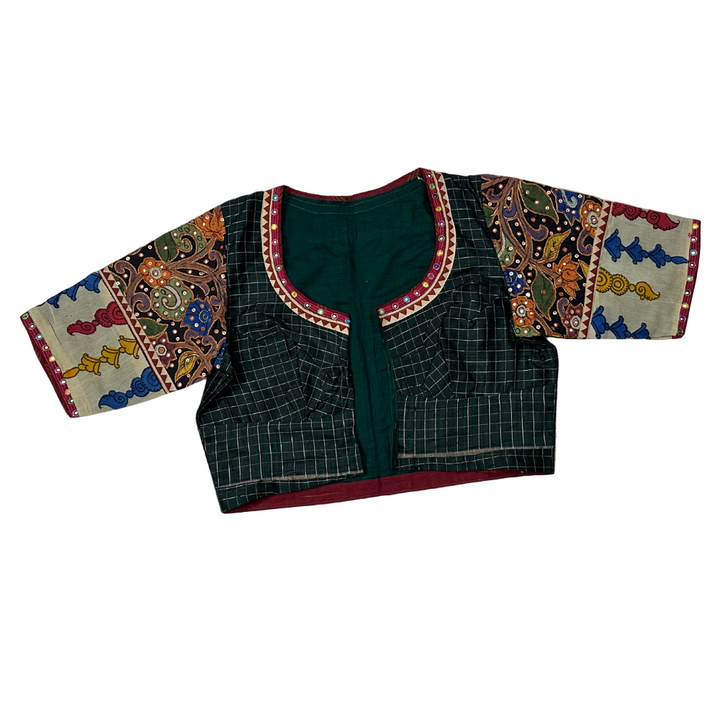 Bottle green raw silk tiny checks with pen kalamkari Rishaba Kunjaram sleeves Kanjeevaram silk pen kalamkari appliqué embroidery temple design - Size 40