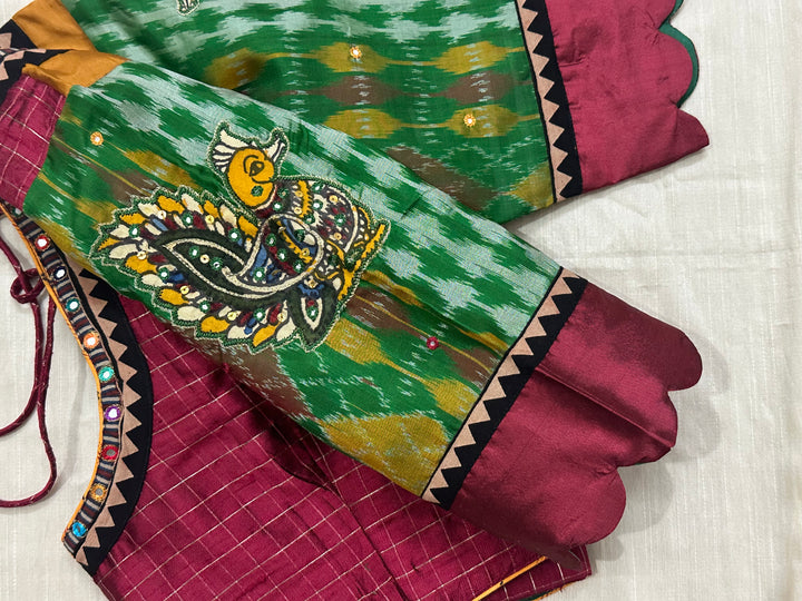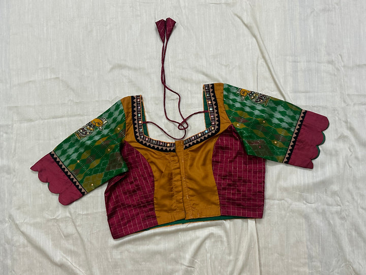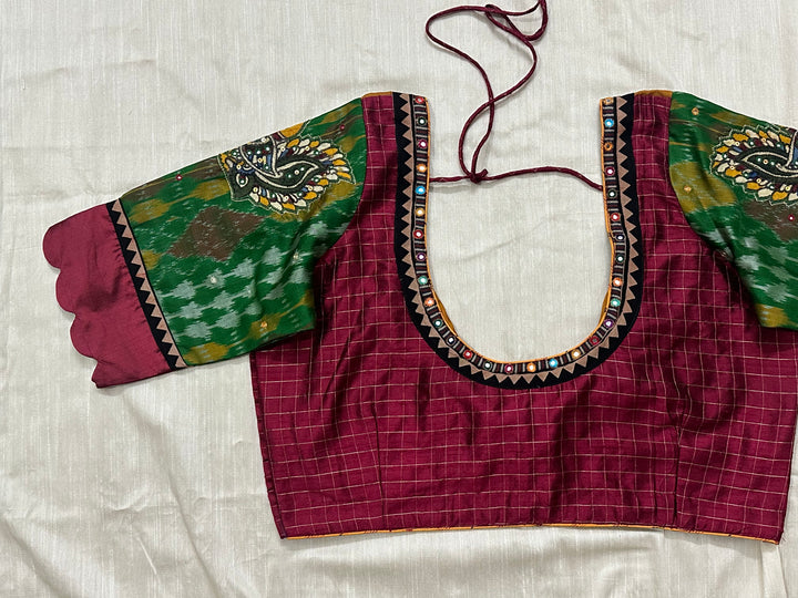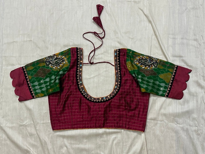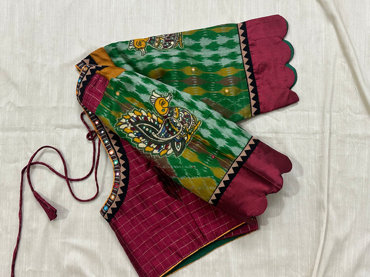 Kanjeevaram podi kattam maroon blouse with Pochampalli silk annam appliqué scallop sleeves - Size 40