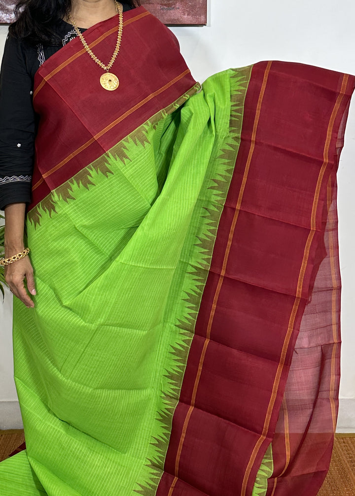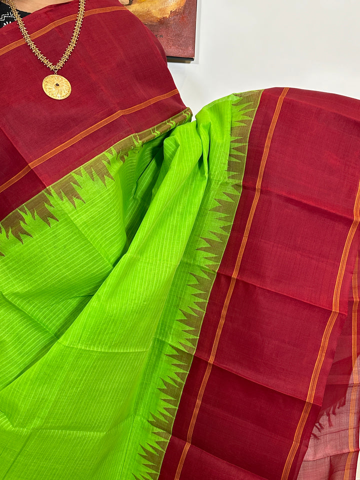 A korvai handwoven treasure from the looms of Kanchipuram. This rare 100-thread count Korvai cotton saree in parrot green and maroon is a tribute to artistry that’s disappearing. The body glows with gentle, woven lines — understated, yet regal.